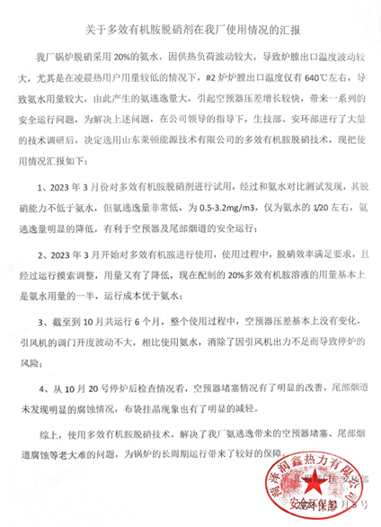 菏泽润鑫热力有限公司2号锅炉为无锡华光锅炉股份有限公司设计生产130t/h 高温高压燃煤循环流化床锅炉。目前该锅炉使用SNCR系统进行脱硝,脱硝剂为20%的氨水溶液,因锅炉运行工况的波动大,氨水脱硝效率稳定性差,导致氨逃逸大,带来空预器压差升高较快,严重影响了锅炉的正常生产及经济效益,采用多效有机胺脱硝技术后,较氨水经济性有了提高,且解决了氨逃逸带来的空预器堵塞、尾部烟道腐蚀等老大难的问题,为锅炉的长周期运行带来了较好的保障。在菏泽润鑫热力有限公司的案例中,采用多效有机胺脱硝技术后,相较于传统的氨水脱硝方法,经济性得到了显著提升,并有效解决了氨逃逸导致的空预器堵塞和尾部烟道腐蚀问题,从而为锅炉的长期稳定运行提供了保障。