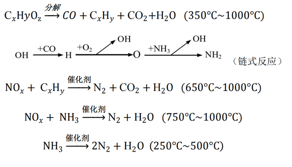 (1)裂解反应:有机成分在高温下快速裂解,裂解后生成大量的CxHy及CO、CO2以及大量的羟基中间物,提高SNCR的链反应速率,低温脱硝效果更好;